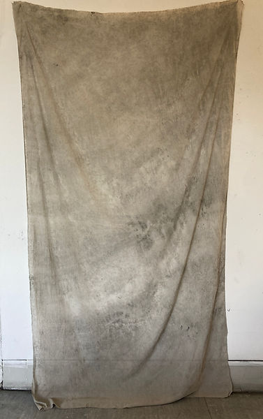 Pigment cloths, sizes from top left: 125x240cm, 90x100cm, 85x120cm and 90x190cm hung together with a trace print from cloth on paper 57x76cm, 85x120cm and 90x190cm hung together